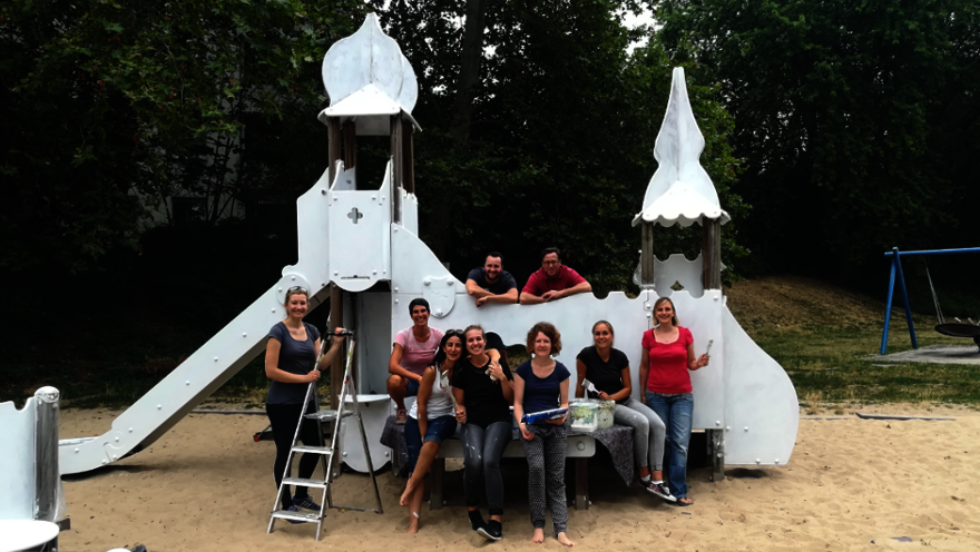 Im Rahmen eines Social Day engagierte sich das INSITE-Team einen ganzen Tag lang auf dem Spielplatz Rödelheim-West in Frankfurt. Die Geräte werden von den Anwohnern neu bemalt. Davor mussten die Rutschen und Klettergeräte gereinigt, grob abgeschliffen und weiß grundiert werden. Hierfür stellte INSITE ein Team zur Verfügung, das sich mit hochgekrempelten Ärmeln an die Arbeit machte.