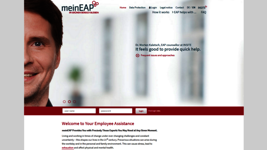Für die Beschäftigten unserer Kundenunternehmen steht ab sofort der Loginbereich unter www.meinEAP.de auch in Englisch zur Verfügung. Hier finden Sie ausführliche Informationen zu den Beratungsfeldern des EAP, Beispielfälle und weitergehende Inhalte zu den Themen, in denen das EAP in Anspruch genommen werden kann.