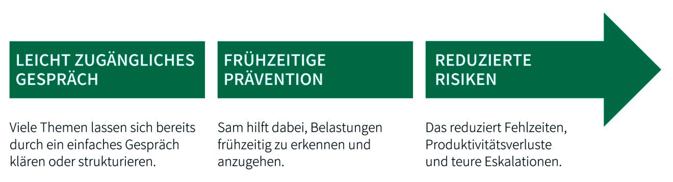 Stärkeres Employer Branding: Mit Sam zeigen Sie, dass Ihnen das Wohlbefinden Ihrer Mitarbeitenden wichtig ist – innovativ, modern und nah an den Bedürfnissen Ihrer Belegschaft.